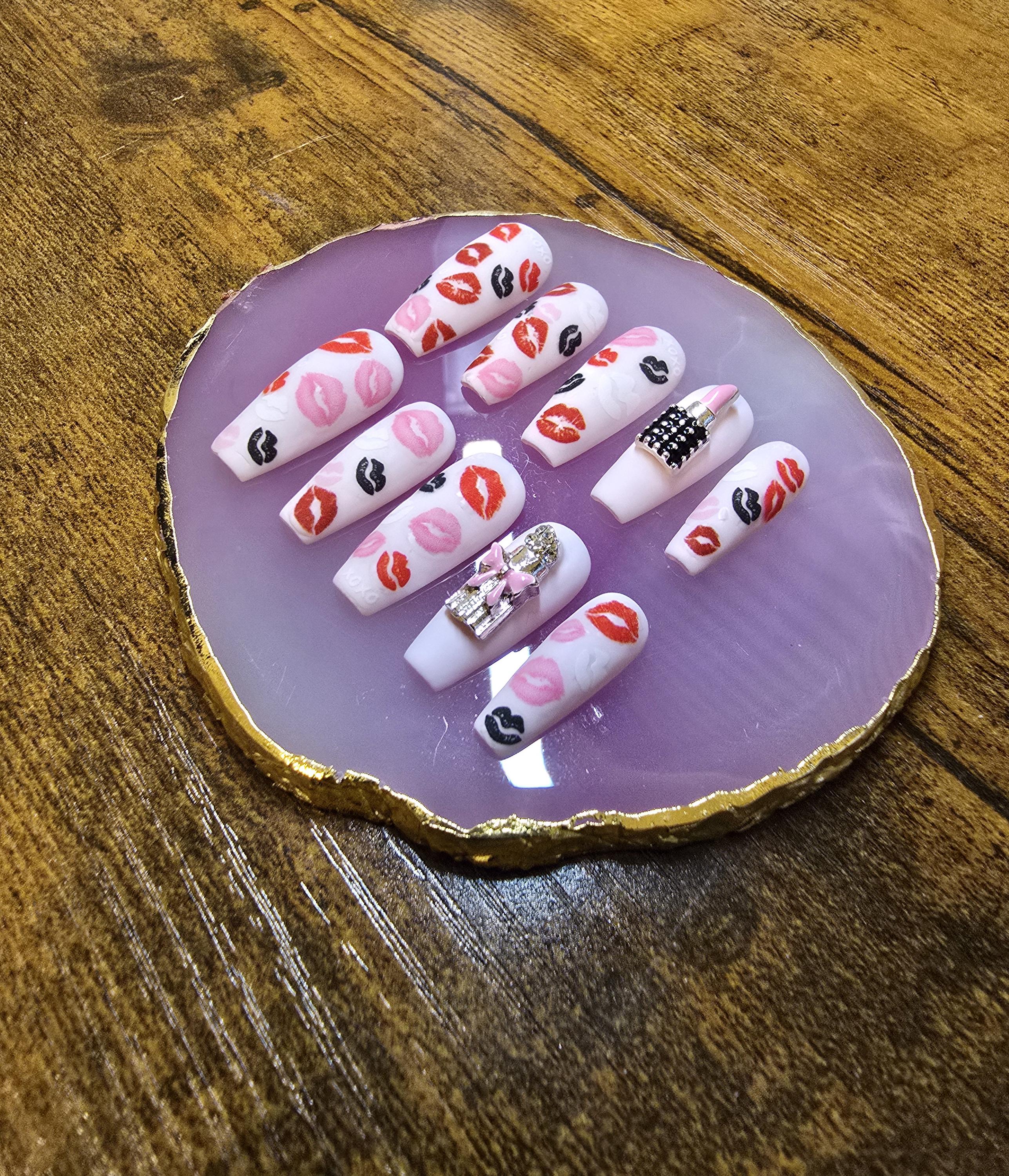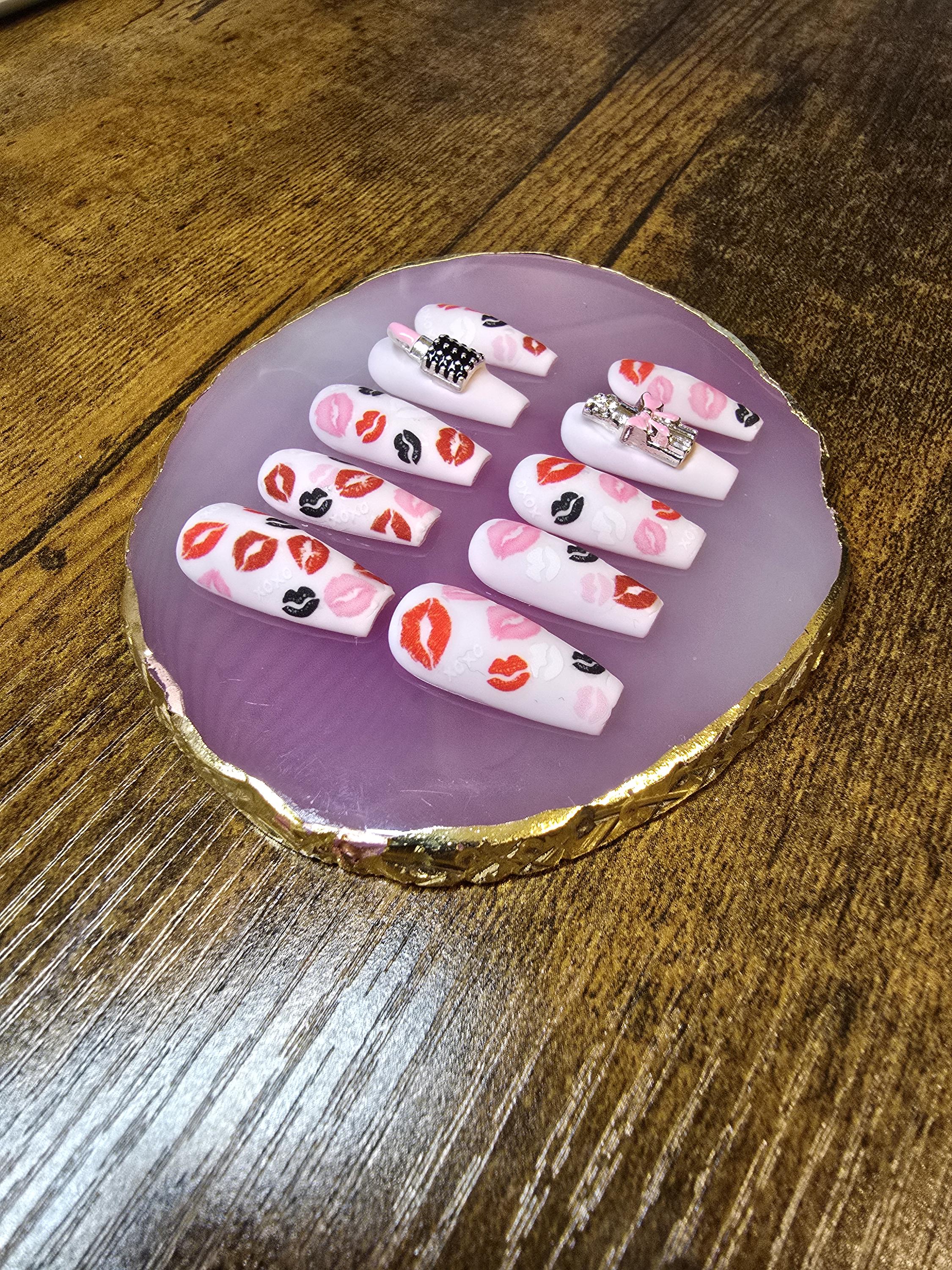 Item includes 10 handmade press on nails made using Après gel-X nails which are strong and won't bend. Gel polish is used ensuring longevity. These press on nails are reusable if taken care of and gently removed. If you are unsure of your nail size I recommend buying one of my sizing kits. If you need a custom size please put your size in the personalization box or message me. For hygienic reasons I won't be accepting returns. Please be aware colors might differ slightly depending on screen viewing on. PLEASE NOTE: Charms and/or decals may differ slightly depending on stock. A MANICURE SET IS INCLUDED WITH EACH ORDER FOR EASY APPLICATION.