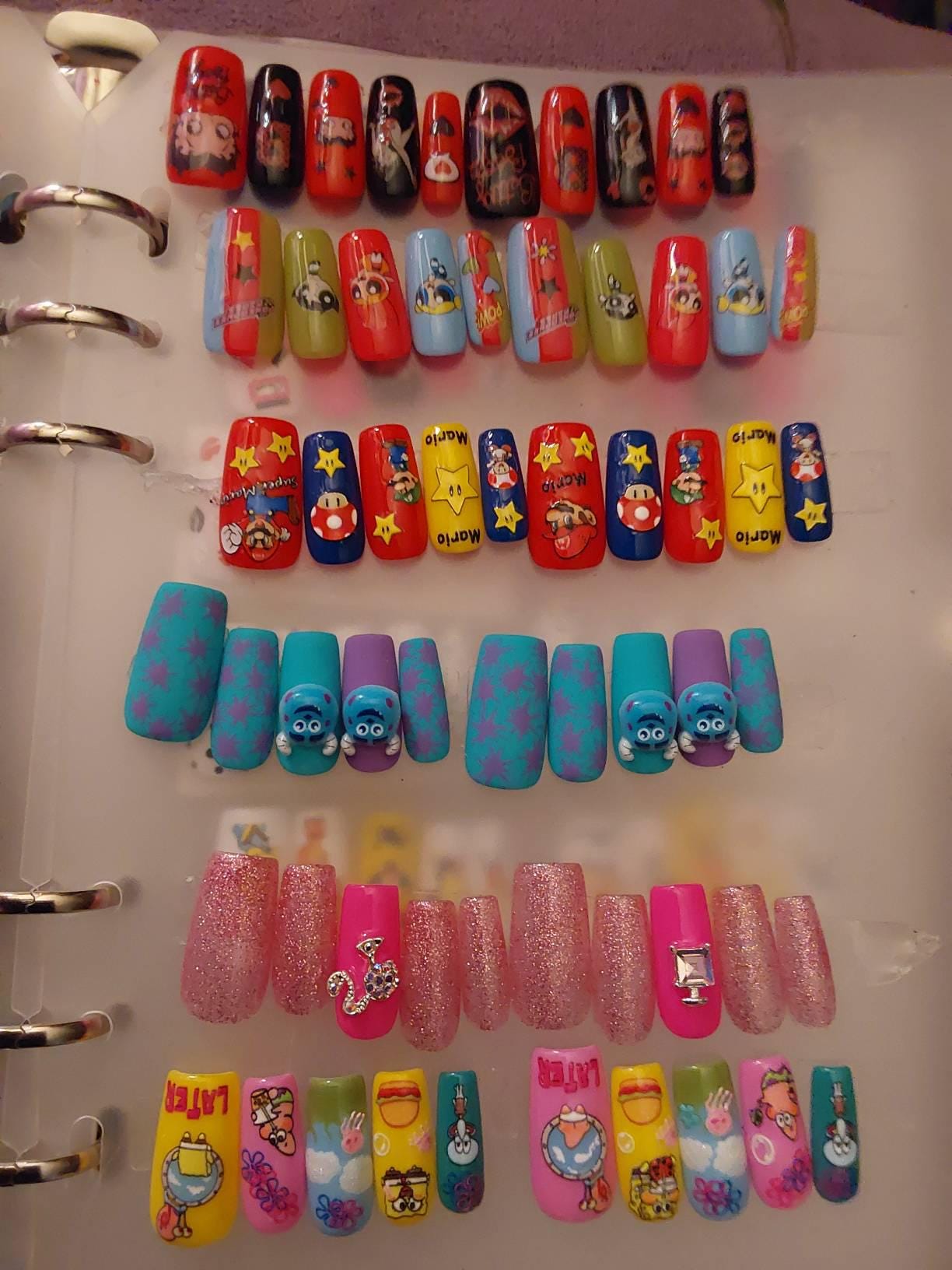 Item includes 10 handmade press on nails made using Après gel-X nails which are strong and won't bend. Gel polish is used ensuring longevity. These press on nails are reusable if taken care of and gently removed. If you are unsure of your nail size I recommend buying one of my sizing kits. If you need a custom size please put your size in the personalization box or message me. For hygienic reasons I won't be accepting returns. Please be aware colors might differ slightly depending on screen viewing on. PLEASE NOTE: Charms and/or decals may differ slightly depending on stock. A MANICURE SET IS INCLUDED WITH EACH ORDER FOR EASY APPLICATION.
