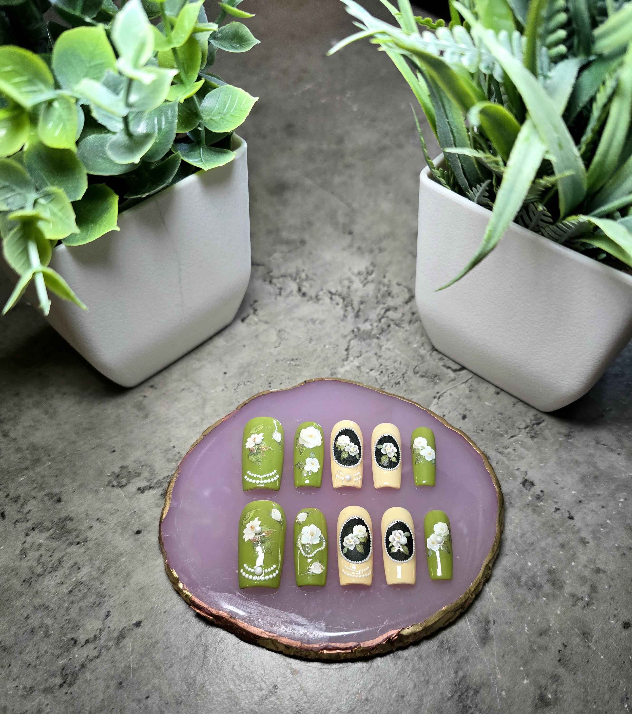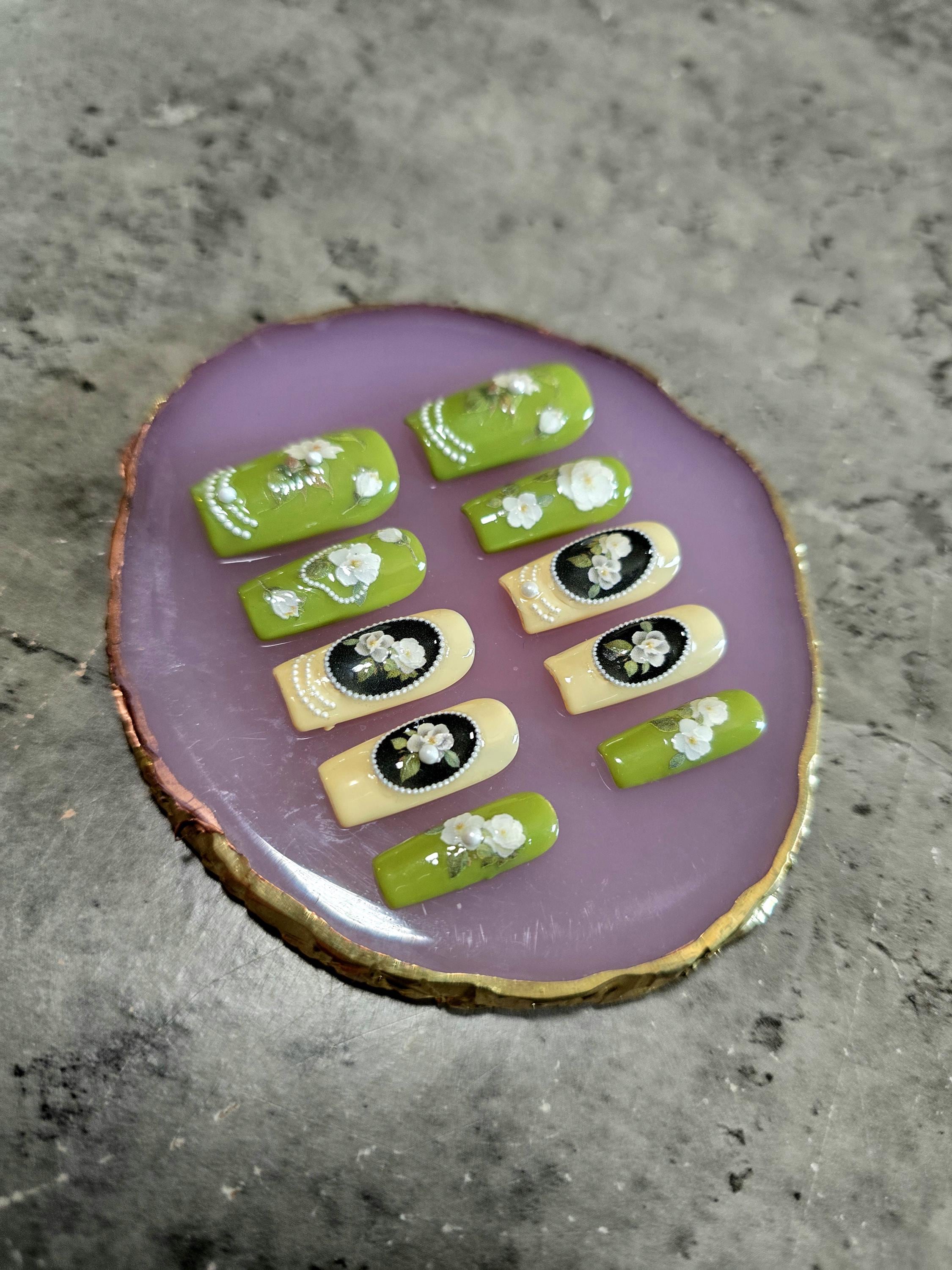 Item includes 10 handmade press on nails made using Après gel-X nails which are strong and won't bend. Gel polish is used ensuring longevity. These press on nails are reusable if taken care of and gently removed. If you are unsure of your nail size I recommend buying one of my sizing kits. If you need a custom size please put your size in the personalization box or message me. For hygienic reasons I won't be accepting returns. Please be aware colors might differ slightly depending on screen viewing on. PLEASE NOTE: Charms and/or decals may differ slightly depending on stock. A MANICURE SET IS INCLUDED WITH EACH ORDER FOR EASY APPLICATION.