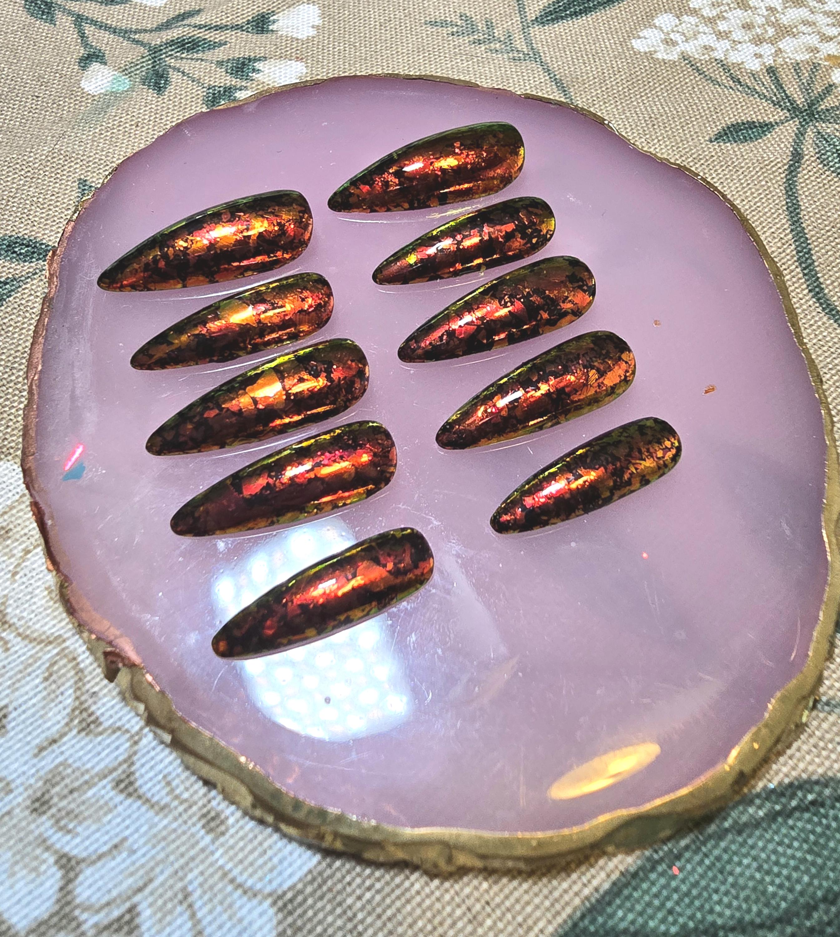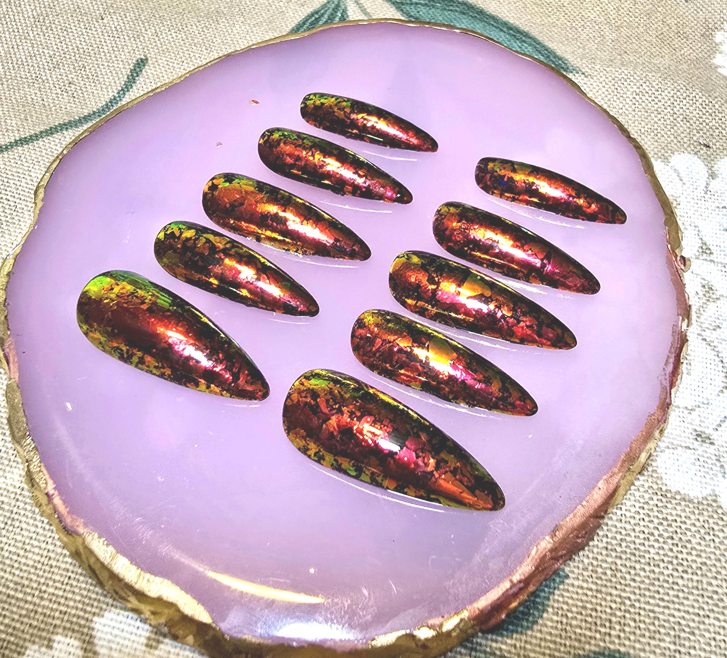Item includes 10 handmade press on nails made using Après gel-X nails which are strong and won't bend. Gel polish is used ensuring longevity. These press on nails are reusable if taken care of and gently removed. If you are unsure of your nail size I recommend buying one of my sizing kits. If you need a custom size please put your size in the personalization box or message me. For hygienic reasons I won't be accepting returns. Please be aware colors might differ slightly depending on screen viewing on. PLEASE NOTE: Charms and/or decals may differ slightly depending on stock. A MANICURE SET IS INCLUDED WITH EACH ORDER FOR EASY APPLICATION.