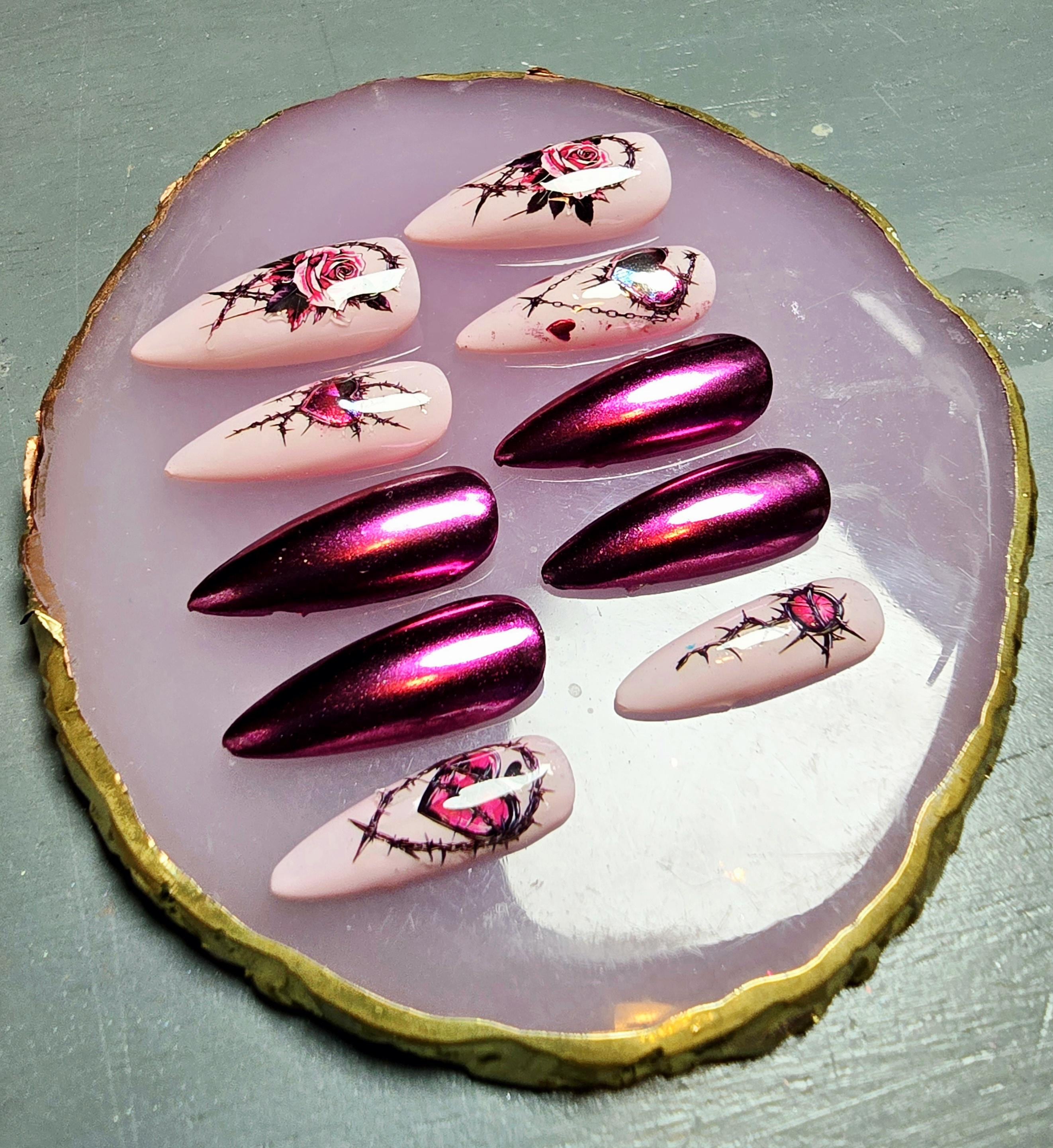 Item includes 10 handmade press on nails made using Après gel-X nails which are strong and won't bend. Gel polish is used ensuring longevity. These press on nails are reusable if taken care of and gently removed. If you are unsure of your nail size I recommend buying one of my sizing kits. If you need a custom size please put your size in the personalization box or message me. For hygienic reasons I won't be accepting returns. Please be aware colors might differ slightly depending on screen viewing on. PLEASE NOTE: Charms and/or decals may differ slightly depending on stock. A MANICURE SET IS INCLUDED WITH EACH ORDER FOR EASY APPLICATION.