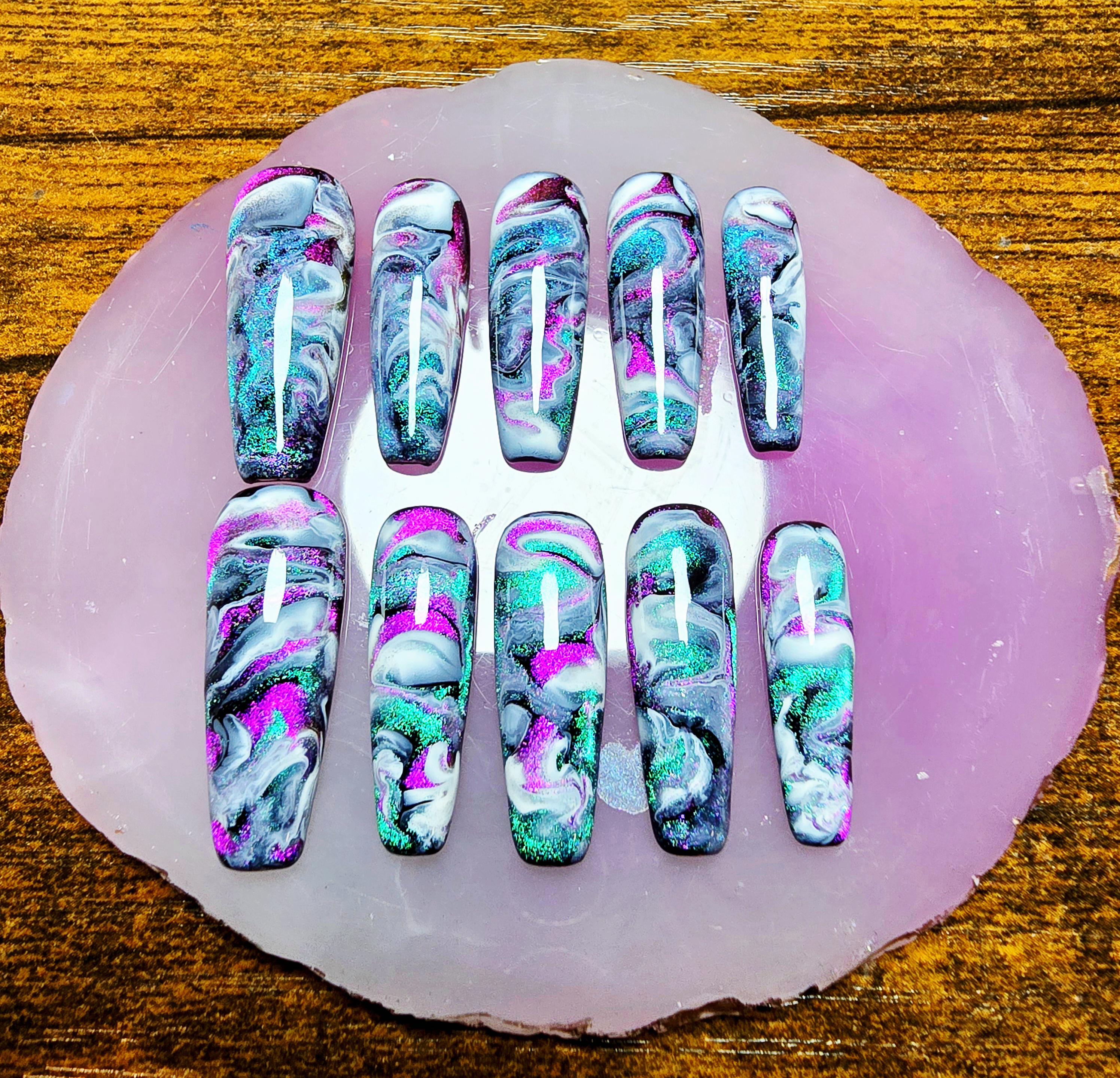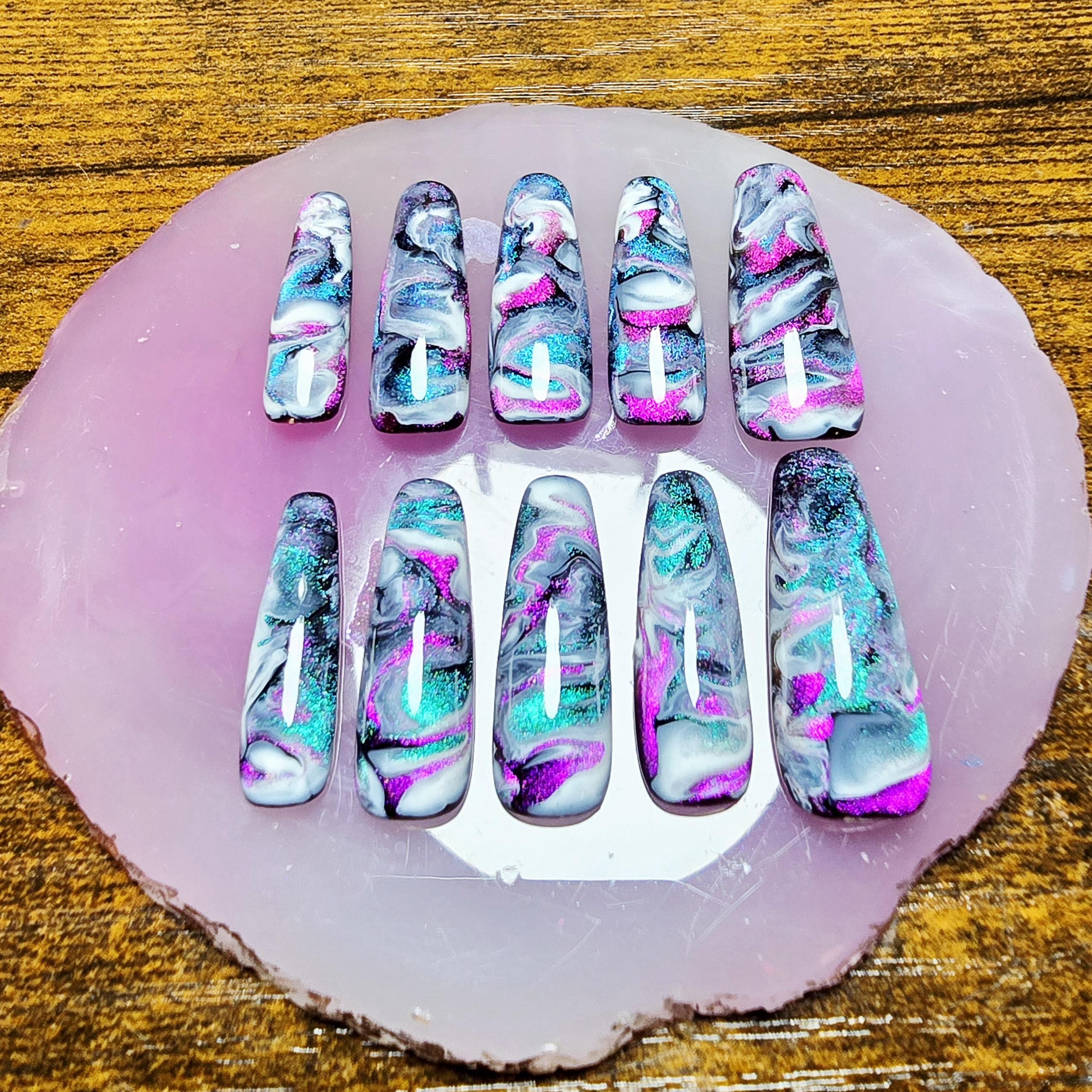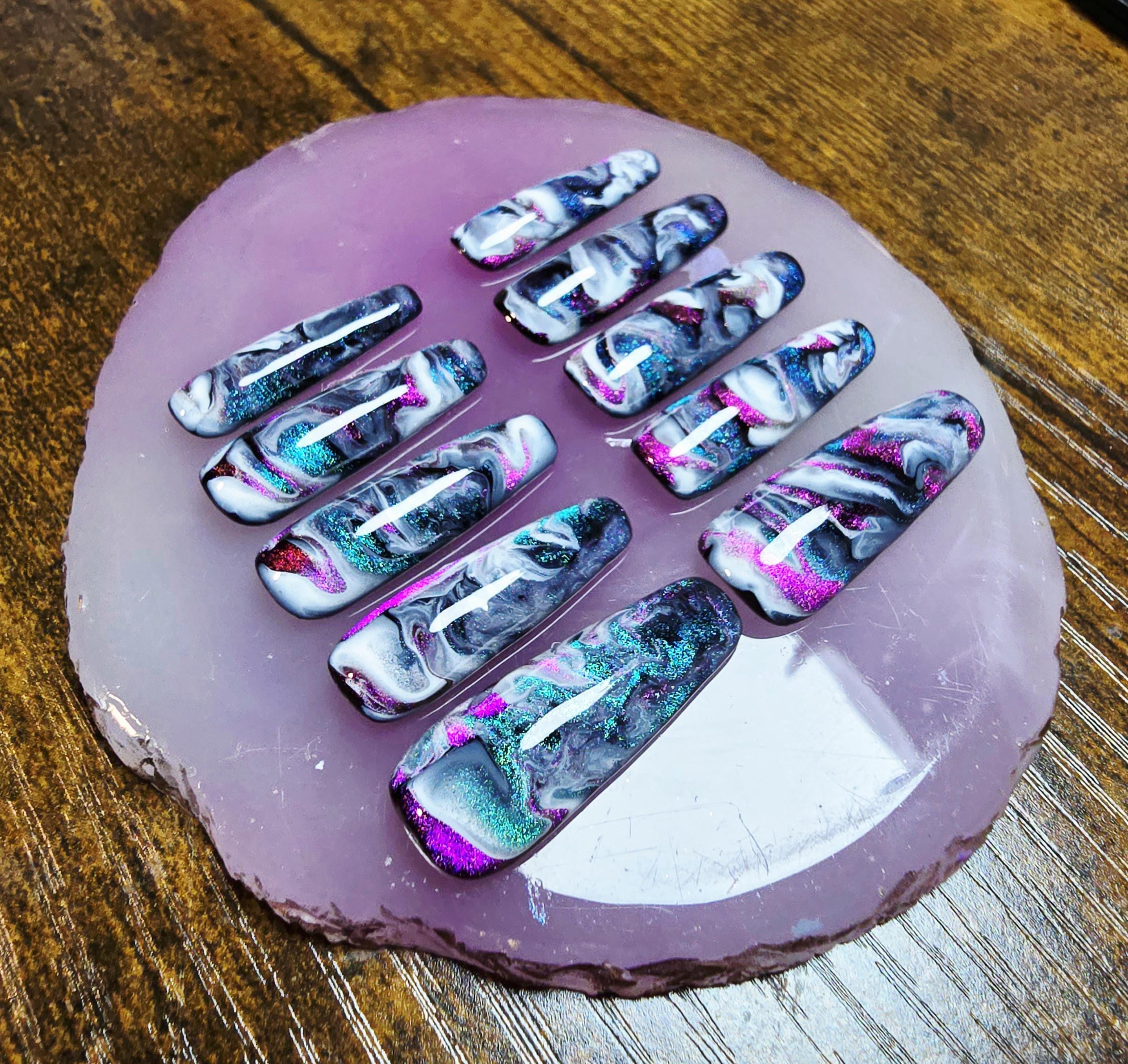 Item includes 10 handmade press on nails made using Après gel-X nails which are strong and won't bend. Gel polish is used ensuring longevity. These press on nails are reusable if taken care of and gently removed. If you are unsure of your nail size I recommend buying one of my sizing kits. If you need a custom size please put your size in the personalization box or message me. For hygienic reasons I won't be accepting returns. Please be aware colors might differ slightly depending on screen viewing on. PLEASE NOTE: Charms and/or decals may differ slightly depending on stock. A MANICURE SET IS INCLUDED WITH EACH ORDER FOR EASY APPLICATION.