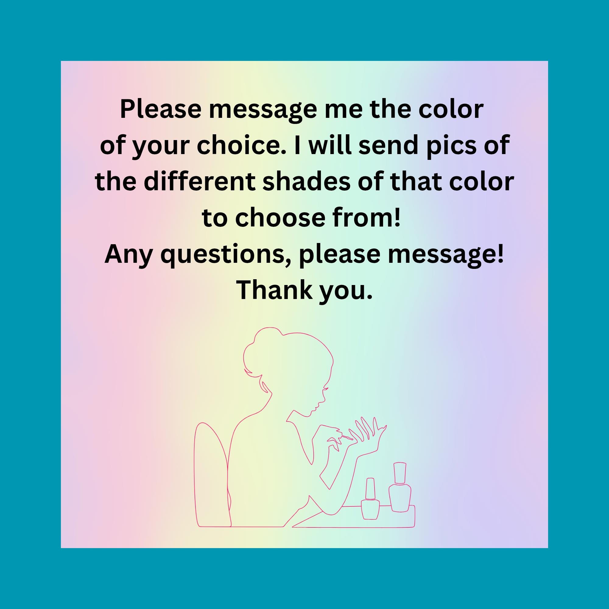 I have many different plain colors available to choose from and different shades as well. BEFORE YOU ORDER, PLEASE MESSAGE ME YOUR COLOR CHOICE SO YOU CAN PICK THE SHADE (if applicable). I will then message you with pictures of that color for you to choose. When you order please put the color you would like in the "personalization" box below.