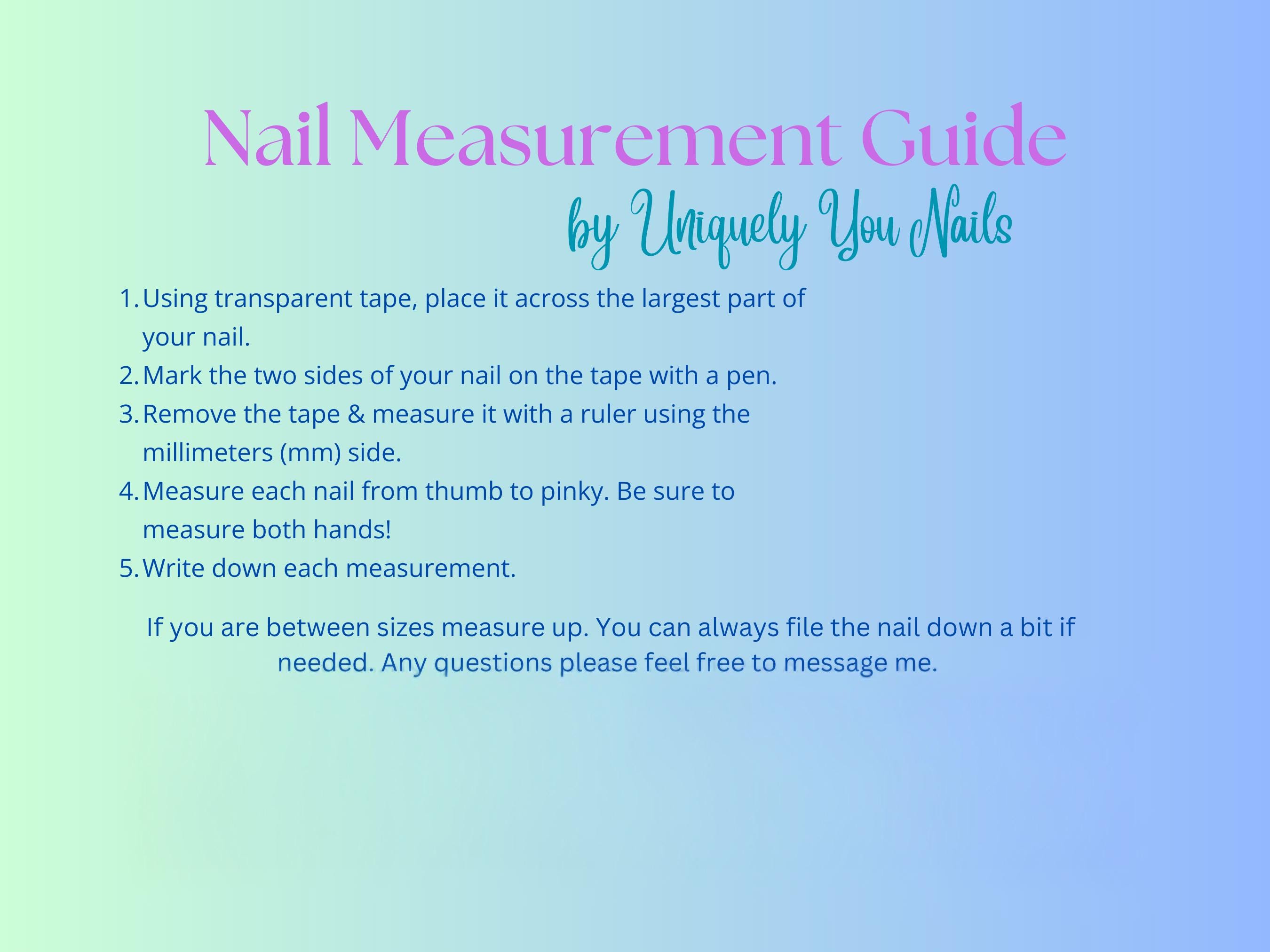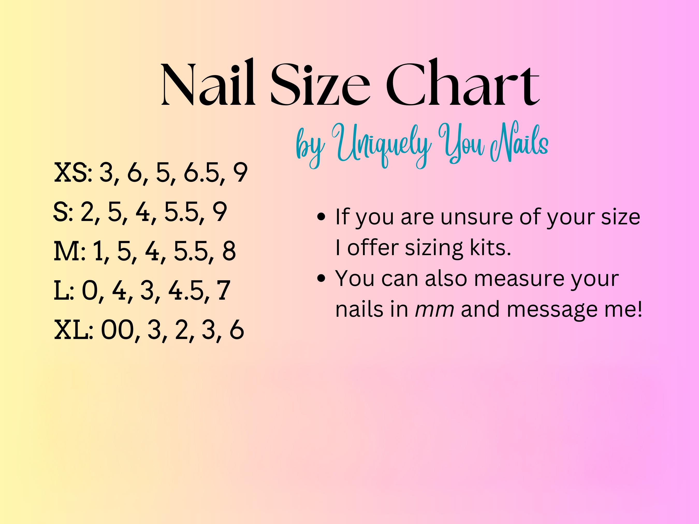 Item includes 10 handmade press on nails made using Après gel-X nails which are strong and won't bend. Gel polish is used ensuring longevity. These press on nails are reusable if taken care of and gently removed. If you are unsure of your nail size I recommend buying one of my sizing kits. If you need a custom size please put your size in the personalization box or message me. For hygienic reasons I won't be accepting returns. Please be aware colors might differ slightly depending on screen viewing on. PLEASE NOTE: Charms and/or decals may differ slightly depending on stock. A MANICURE SET IS INCLUDED WITH EACH ORDER FOR EASY APPLICATION.