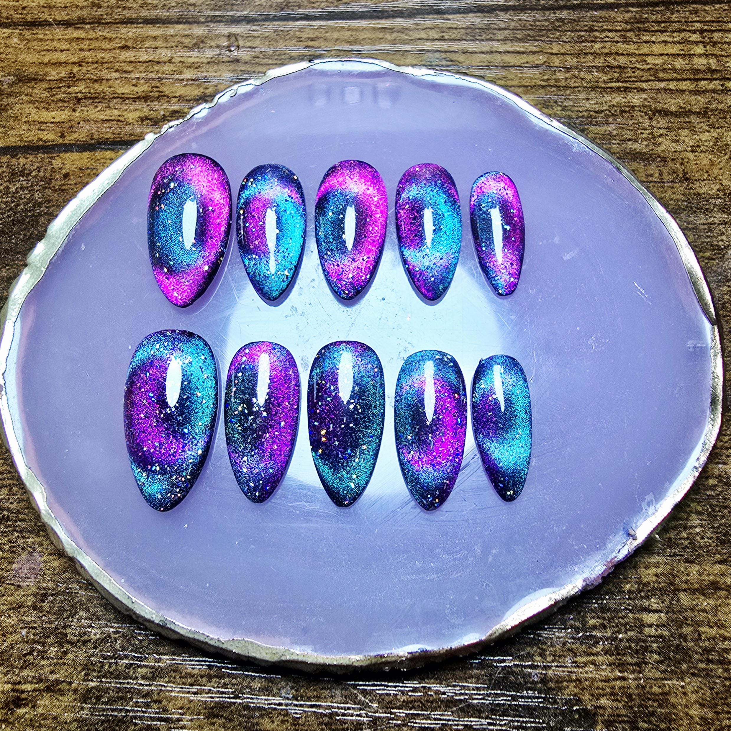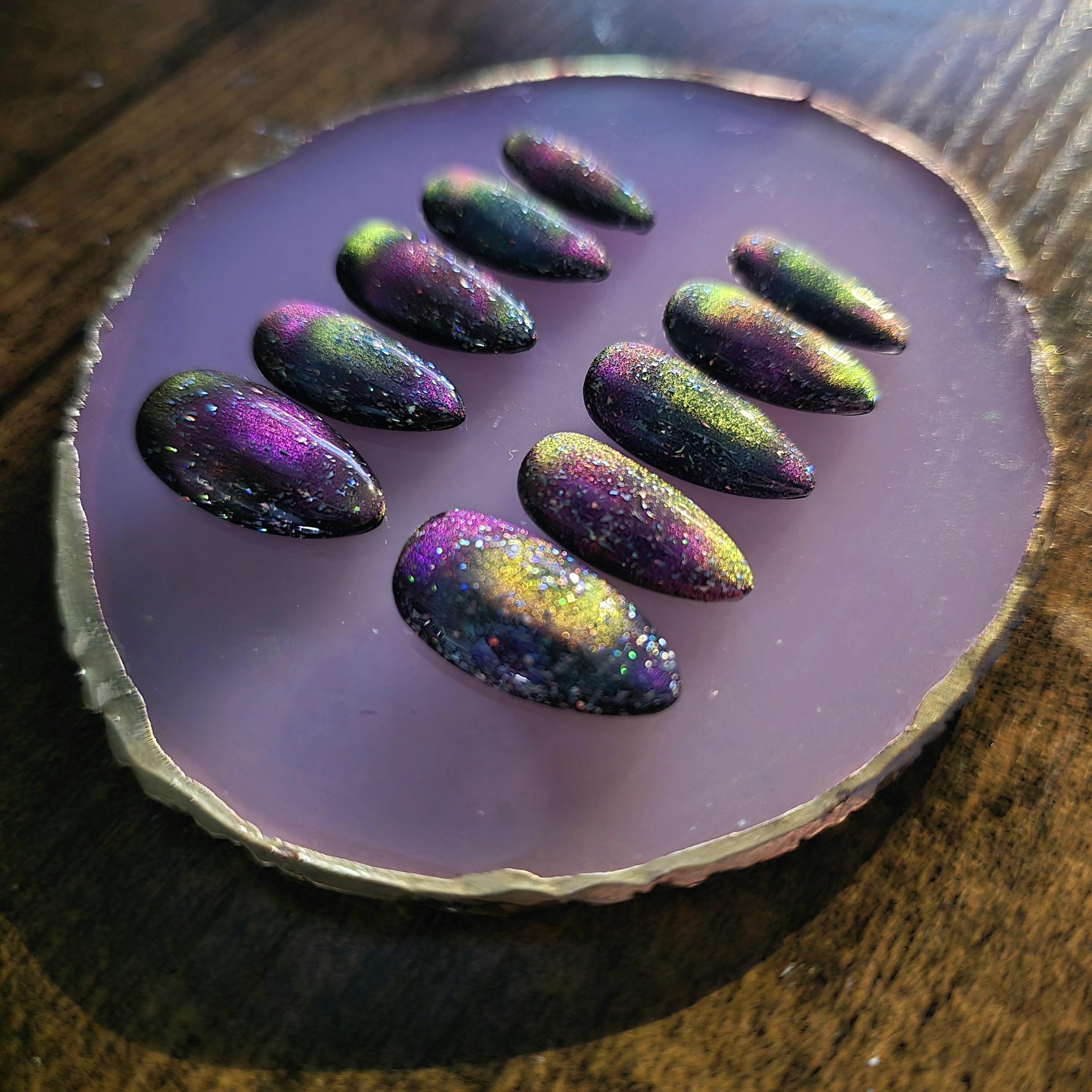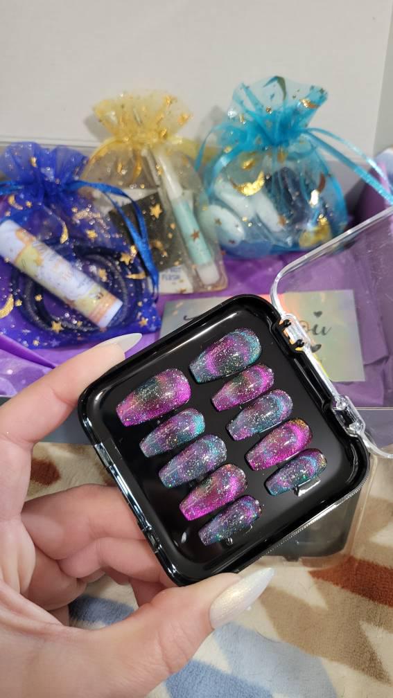 Ordering nails from Regina was an absolute pleasure from start to finish. When I reached out with questions she replied promptly and also kept me updated when she was shipping my order. The nails are gorgeous especially in person, my photos don't do them justice! EDIT: I can't stop looking at all the changing colors, they're MESMERIZING ♥️ so happy I took a chance with a new shop!